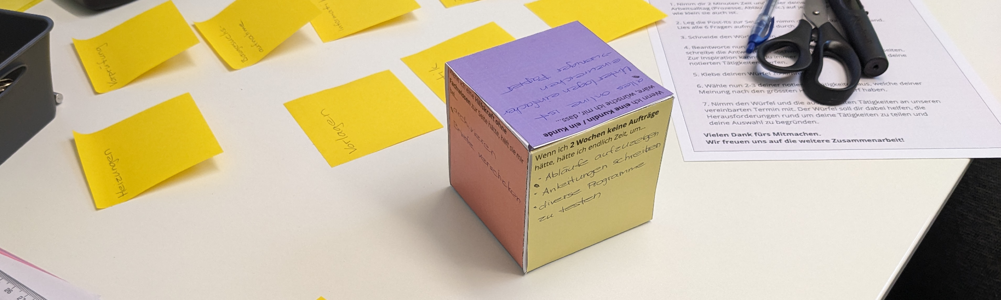 Die Mitarbeitenden führten die «Würfelstunde» eigenständig mithilfe der Anleitung durch. Konzentriert durchlesend, notierend, schnipselnd, auch mal lachend, und schliesslich zusammenklebend – nach weniger als 15-Minuten war die Kurzanalyse vorbei. Die Mitarbeiterin, bei der ich physisch anwesend war, begann direkt ihre Antworten vorzustellen. Sie kam ins Sprudeln, notierte weitere Verbesserungenpotentiale und zeigte mir Dinge auf ihrem Bildschirm. Nach weiteren zehn Minuten schlossen wir die Aufgabe, um die aufgeworfenen Fragen im eigentlichen Beratungstermin weiter zu bearbeiten. Den Würfel behielt die Mitarbeitende bei sich am Arbeitsplatz.