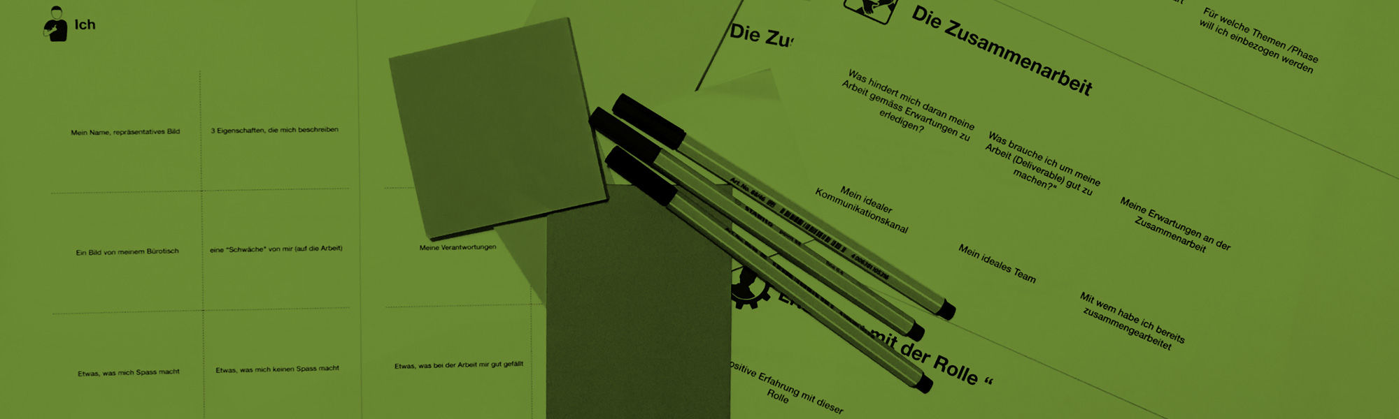 Die Canvas «Meine Erwartungen an das Projekt» werden auf einer Linie nebeneinander an die Wand gehängt. Mit dieser Anordnung sind die Post-Its in die Bereiche Projekt, Zusammenarbeit und «Erfahrung mit der Rolle» verteilt. Die Gruppe soll die Post-Its bei Bedarf gruppieren, wenn Clusters erkannt werden.