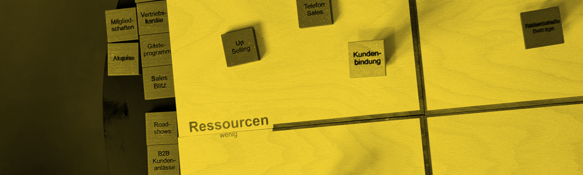 Mit dem Kunden die relevanten Ziele erarbeiten (blaue Holzplättchen), wie zum Beispiel: Reichweite, Bekanntheitsgrad, Umsatz, Image, Kundenbindung, etc.