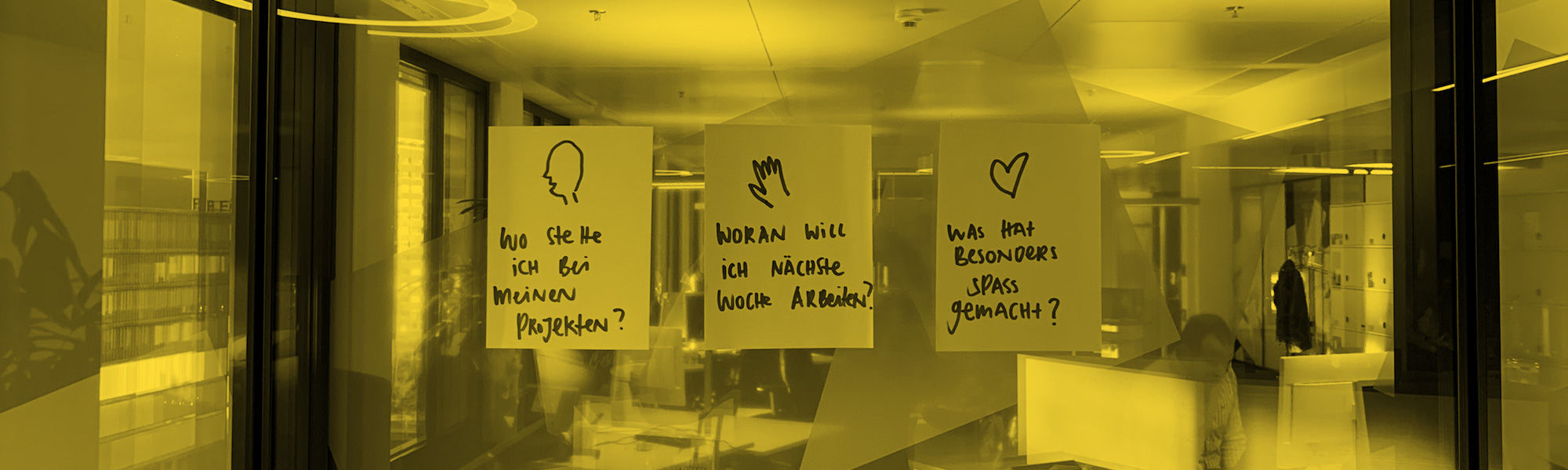Um die Kopf-Hand-Herz Methode für Feedbacks oder Planungsmeetings einzusetzen, werden die Fragen und Antworten nicht nur mündlich ausgetauscht, sondern pro Person schriftlich auf 3 Post-it’s festgehalten, jeweils mit einem kleinen Icon / Scribble zu Kopf, Hand oder Herz um die jeweilige Frage zu identifizieren. Die Fragen und Antworten können an einem gemeinsamen ersichtlichen Punkt aufgehängt (oder vom*von der Facilitator*in gesammelt) werden und dienen beim nächsten Meeting als Einstieg / Reflektion. Spannend ist, die selbe Fragestellung über den Projektverlauf hinweg beizubehalten und zu beobachten und diskutieren, wie sich die Antworten / Haltungen entwickeln.