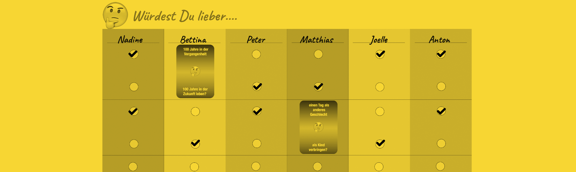 - Pro Frage und Spieler*in eine Markierung (z.B. Häckchen) vorbereiten.