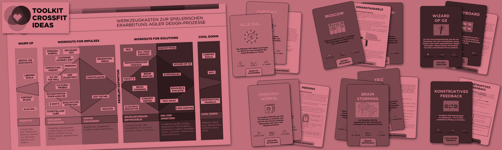 Mit dem Methodenkit Crossfit Ideas können die einzelnen Schritte im Design-Prozess einfach erarbeitet werden. Man bewegt sich in den vier Feldern des Double Diamond (Discover, Define, Design und Deliver) und kann sich daran orientieren. Zusätzlich zu den vier Work out Feldern gibt es, wie im Crossfit üblich, eine Warm up und eine Cool down Phase. Zu jeder Phase stehen Methoden zur Verfügung. Nun geht es darum, wie man spielerisch, gemeinsam zum Ziel kommt und dies im Teamprozess.