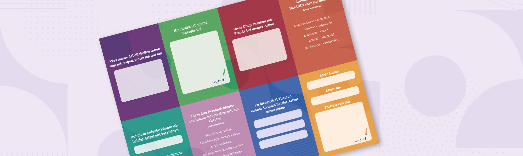 Die mentorierende Person stellt die Methode kurz vor. Die Teilnehmenden erhalten nun alle ein ausgedrucktes, auseinandergefaltetes A3 mit 8 farbigen Feldern, bestückt mit persönlichen und beruflichen Fragen. Stifte liegen bei allen Teilnehmenden bereit und es wird nochmals darauf hingewiesen, dass zwei der Fragen zeichnerisch auszufüllen sind – ein Füller-Symbol verdeutlicht dies.