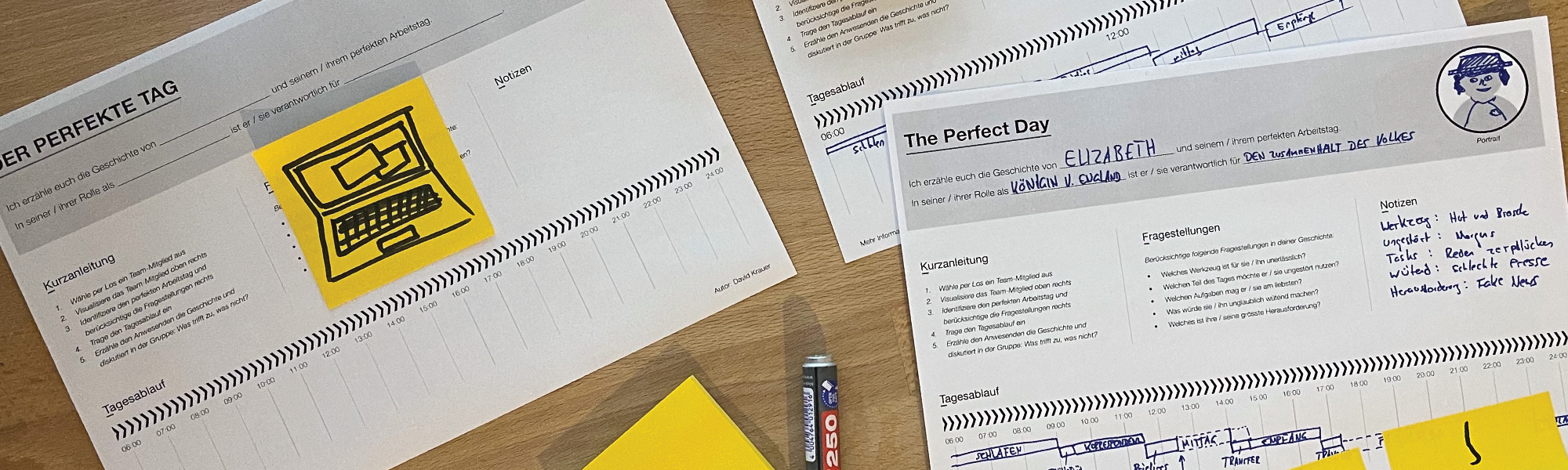 Das Team reserviert sich zu Beginn des neuen Sprints die Zeit für die Anwendung der Methode «Der perfekte Tag». Die Moderatorin, eine Kollegin aus einem anderen Team, stellt zuerst die Methode vor: Jedes Team-Mitglied soll sich für einen zufällig zugeteilten Team-Kollegen oder Team-Kollegin eine Geschichte überlegen, die dessen perfekten Arbeitstag beschreibt. Die Moderatorin erwähnt, dass die Geschichte gern etwas utopisch sein soll, aber nicht zu abgehoben. Sie erzählt als Beispiel, wie der perfekte Arbeitstag von Queen Elizabeth II aussehen könnte. So erhalten sich die Teilnehmenden eine Idee davon, was sie erarbeiten sollen. In der Geschichte werden spezifische Fragestellungen, die die Zusammenarbeit prägen, berücksichtigt. Einzeln erarbeiten die Teilnehmenden die Geschichten und stellen sich diese gegenseitig vor. Sie visualisieren den Tagesablauf auf einem Zeitplan. Es folgt eine weitere Runde, in der die Team-Mitglieder die wichtigsten Erkenntnisse teilen. Sie beschreiben, was zutraf, was nicht und was ihnen besonders aufgefallen ist.