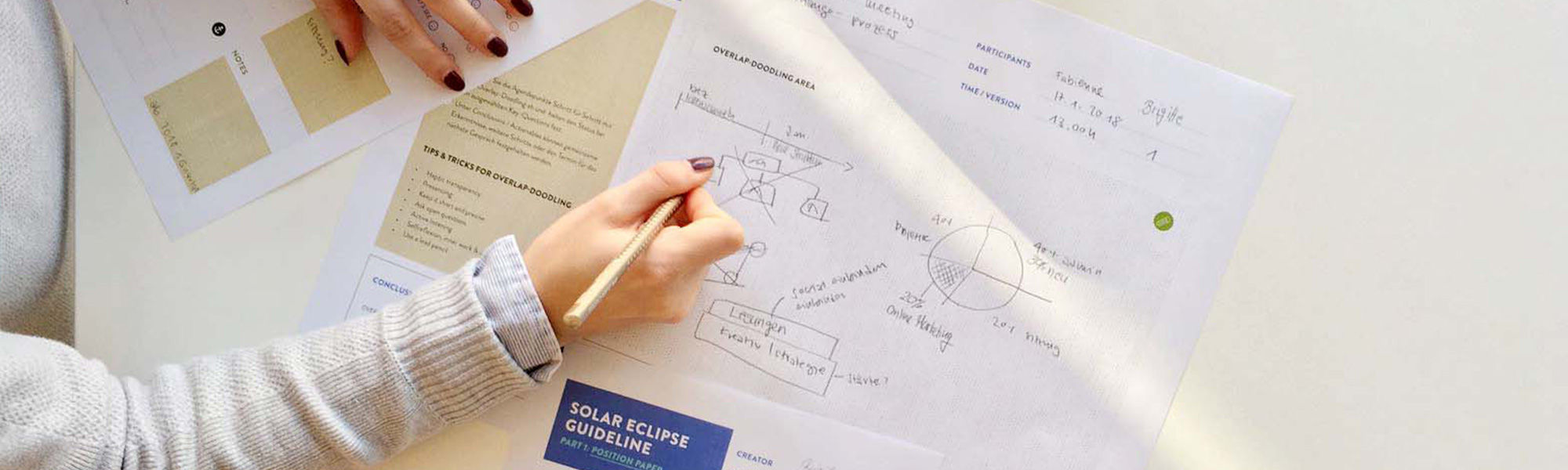 Für mich hatte sich bei der gegenwärtigen Reorganisation in einem ersten Schritt die «Befreiung der Wahrnehmung aus dem Gefängnis der Vergangenheit und sie aus der Zukunft operieren zu lassen» als wichtig und richtig erwiesen (Methode Presencing der Theory U). Darauf aufbauend setzte ich die von mir entwickelte Solar Eclipse Guideline ein. Um sich gedanklich auf das Kick-off-Gespräch vorzubereiten und einzustimmen, füllten beide Teilnehmenden ihr Position Paper aus. Während des Meetings wurde das Overlap-Doodling als Bestandteil der Methode eingesetzt. Wir identifizierten durch einfache Aufzeichnungen und der Key-Question-Agenda die Teamzusammenstellung und den Umstrukturierungs-Zeitstrahl.