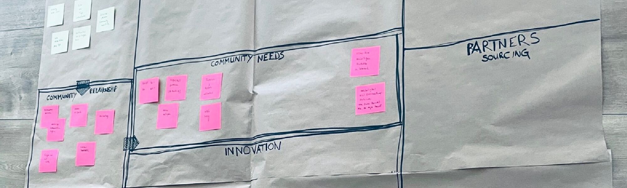 Vorgängig sortiert, gruppiert und strukturiert der*die Moderator*in die Textanworten und Bilder und bereitet diese für den Workshop auf einem Board auf. Das Community-Centered Briefing Canvas Template wird grossformating auf Papier gezeichnet und im Meeting-Raum aufgehängt.