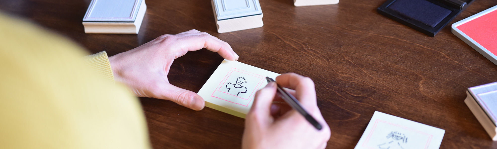 Als Workshopleiterin wähle ich die Metapher des Bilderrahmens, um die Beziehungsgeflechte zu visualisieren. Unterschiedliche Formen von schlicht, verspielt, ausgewogen, über dick, dünn bis hin zu verschachtelt, dienen als visuelle Stütze und helfen Charakteren zu untermalen und wortwörtlich in einen Rahmen zu setzen. Ich produzierte dafür Stempel mit Rahmen-Sujets, im Format eines Post-it’s.