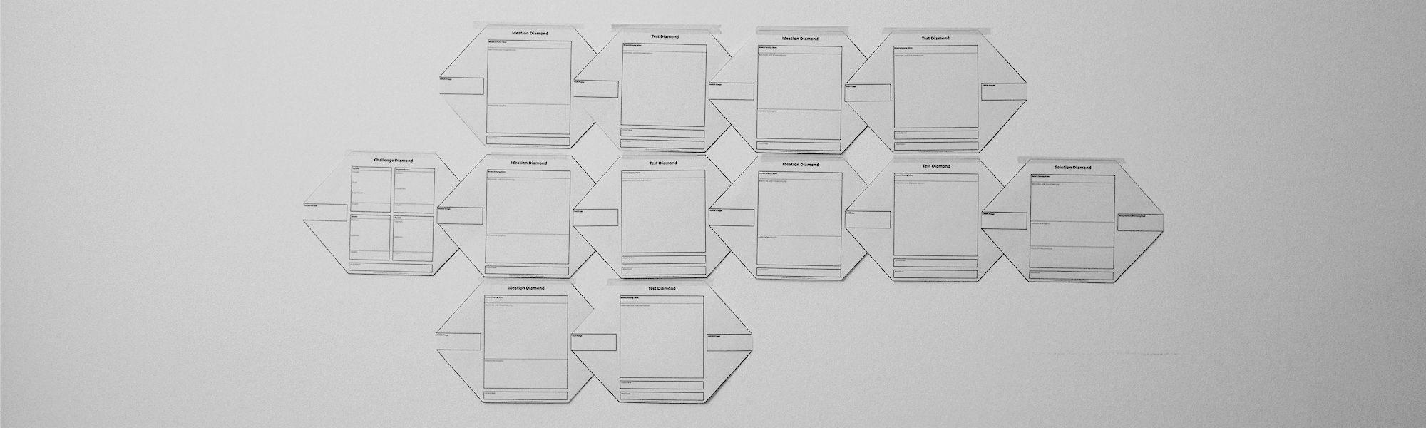 Die ausgefüllten Diamante werden jeweils über alle Workshops aneinander gereiht. Und zeigen so den gesamten Prozess sowie die nachvollziehbare Argumentationskette auf.