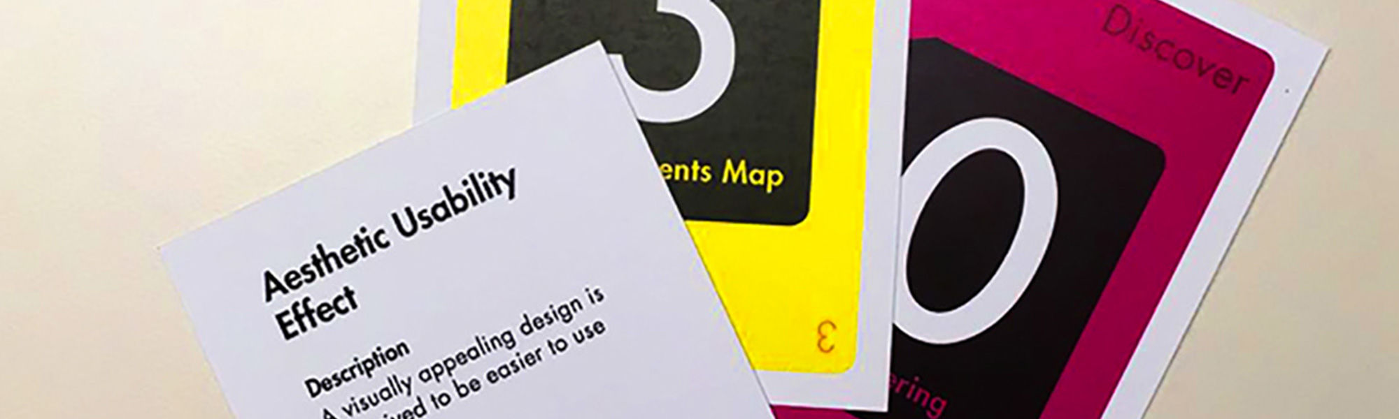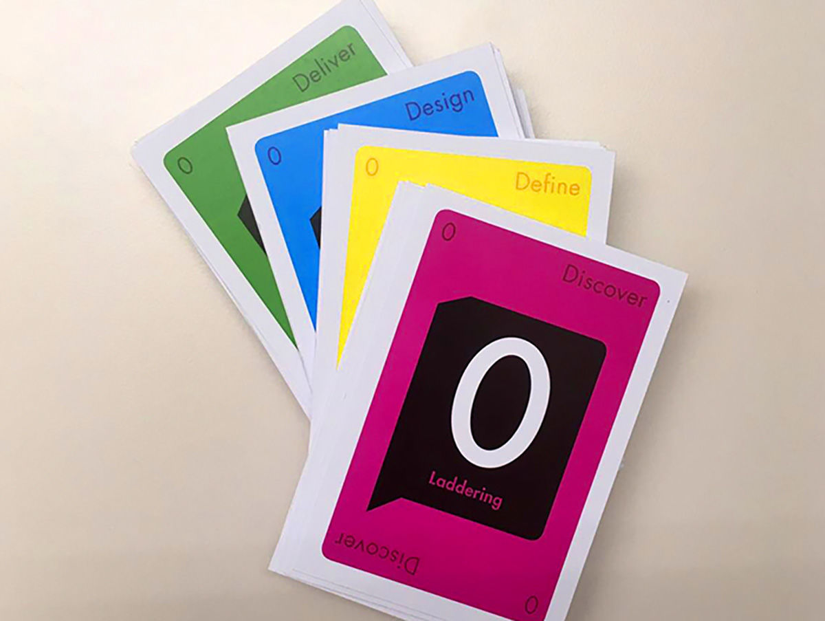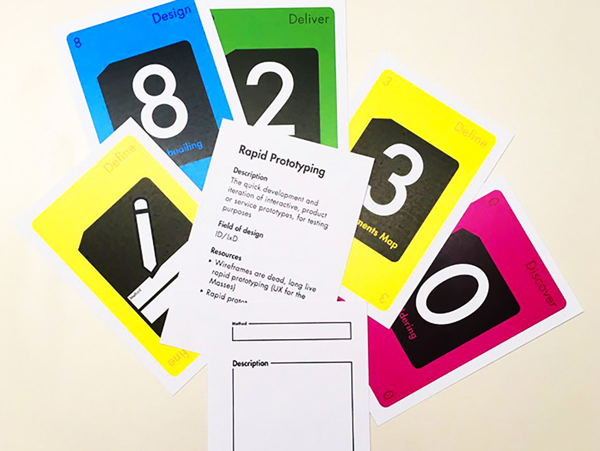 Das methodische Kartenspiel unterteilt die Kartenlevel in 4 Phasen - Farben nach dem 4D Modell von frog design (Discover - Rot/ Define - Gelb/ Design - Blau/ Deliver - Grün).