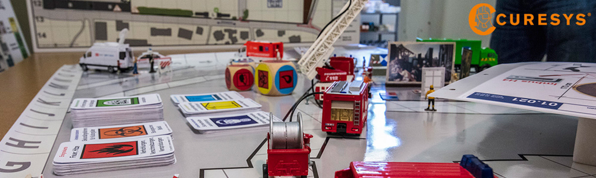 Nach dem Erstellen der KGS-Notfallplanung wird eine Übung mit allen Beteiligten durchgeführt. Um die komplexen Abläufe auf dem Schadenplatz vorzubereiten wird das «Notfall-Simulations-Spiel» eingesetzt. Die Teams können im kleinen Massstab inhouse die Übung spielerisch und ohne Zeitdruck in Begleitung der CURESYS-Moderierenden durchspielen; die Planung korrigieren und die Erkenntnisse für die grosse Live-Übung einsetzen.